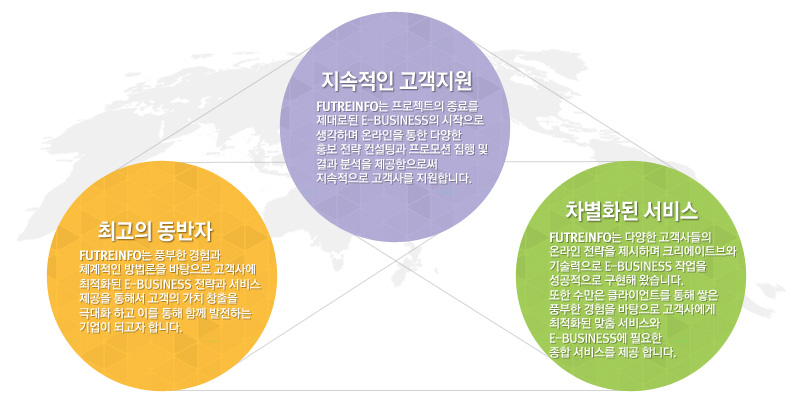 Futreinfo는 고객지향적이며 창의적인 디자인과 기술지향적인 마인드를 기본으로하여 고객사 및 직원과 주주 모두에게 좋은 결과를 드리는 것을 목표로 항상 발전하고 있습니다.
